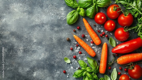 A colorful assortment of vegetables including tomatoes, carrots, and peppers, alongside fresh herbs and spices, creates an inviting atmosphere for cooking