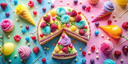A colorful birthday cake surrounded by sprinkles, candy, and fruit, with a single slice missing and the perfect bite taken out