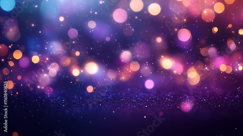 A colorful, blurred background with vibrant bokeh lights in shades of purple, pink, and gold, creating a dreamy and festive atmosphere.