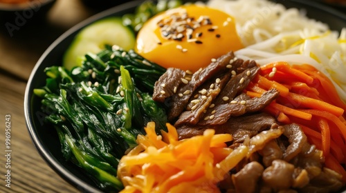 A colorful bowl of bibimbap featuring vegetables, beef, and an egg yolk.