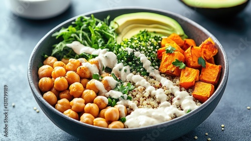 A colorful Buddha bowl with quinoa, avocado, chickpeas, roasted sweet potatoes, and a tahini drizzle.