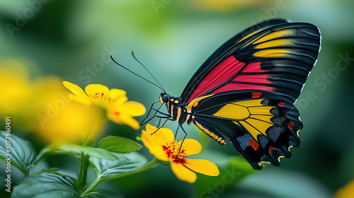 A colorful butterfly with black, red, and yellow wings perched on the edge of vibrant green leaves near bright yellow flowers