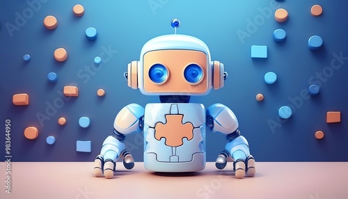 A colorful, cartoonish robot with large eyes and a puzzle piece on its chest, set against a vibrant blue background with geometric shapes.