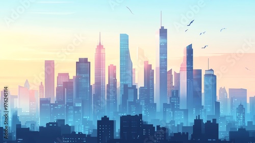 A colorful, cartoon-style cityscape with birds flying over it.