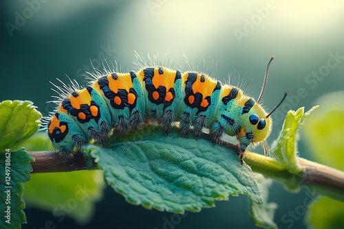A colorful caterpillar with vibrant patterns rests on a green leaf.