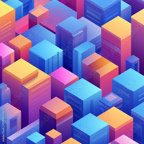 A colorful cityscape made up of many different colored cubes. The colors are bright and vibrant, giving the impression of a lively and energetic urban environment. The image is a work of abstract art