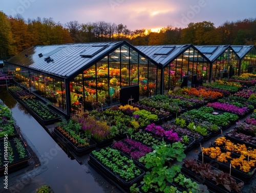 A colorful collection of flower-filled greenhouses glows against a twilight sky, highlighting the beauty of nature and human cultivation in harmony.