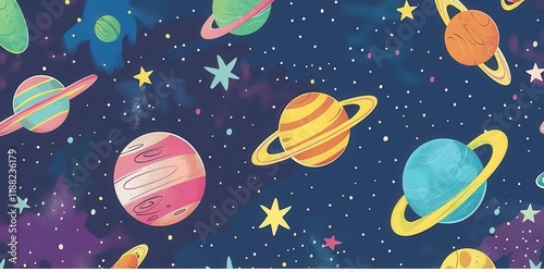 A colorful cosmic scene featuring planets, stars, and a dark space background.