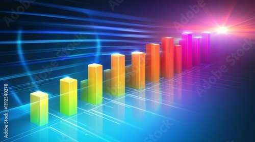 A colorful D bar graph with glowing, stacked bars, illustrating progress and data analysis in a vibrant, high-tech setting