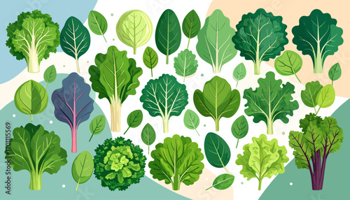 A colorful flat vector illustration featuring a diverse assortment of fresh leafy green vegetables and salad greens