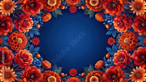 A Colorful Floral Border With Vibrant Orange And Red Blooms Surrounding A Deep Blue Background