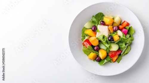 A colorful fresh salad with mixed vegetables and feta cheese in a white bowl on a clean white surface, top-down view, and healthy eating concept.