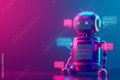 A colorful, futuristic robot with chat bubbles, symbolizing communication and technology.