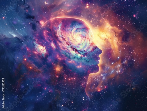 A colorful galaxy with a head in the middle. The galaxy is full of stars and planets, and the head is the only thing that stands out. Scene is mysterious and otherworldly