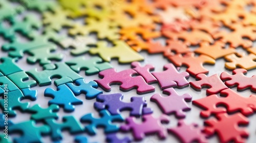 A colorful geometric puzzle, spread out on a white surface, each piece perfectly aligned, bright and vivid colors, soft natural light