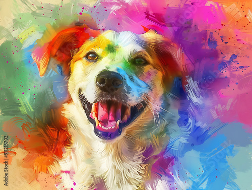 A colorful, happy dog, painted in vibrant orange and blue hues, perfect for pet-themed designs and joyful celebrations.