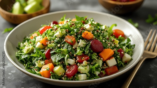A colorful, healthy salad featuring mixed greens, vegetables, and quinoa, served in a bowl with a fork, promoting a nutritious lifestyle.