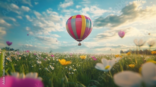 A colorful hot air balloon rises above a vibrant wildflower field on a sunny day in a picturesque landscape