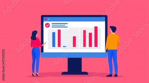 A colorful illustration of two people analyzing a data report on a computer screen, showcasing a vibrant workspace atmosphere.
