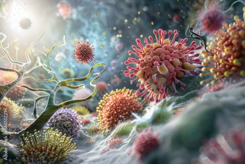 A colorful image of various bacteria and viruses floating in a sea of green