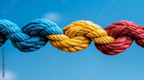 A colorful, intertwined rope against a bright blue sky symbolizes strength, connection, and teamwork.