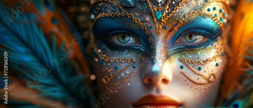 A colorful masquerade mask in bright colours on a blurred festive background with bokeh , party, Rio, Venice and Tenerife carnival concept banner poster or card design copy space