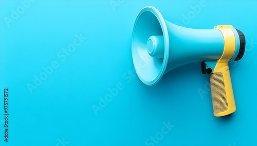 A colorful megaphone rests against a vibrant blue background, symbolizing communication and amplification of voice.