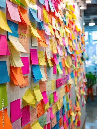 a colorful office wall covered in multitude of sticky notes from creative brainstorming session illustrating project planning agile workflow management reminders and tasks