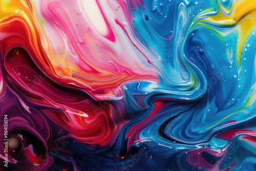A colorful painting with a blue and red swirl. The painting is abstract and has a lot of different colors