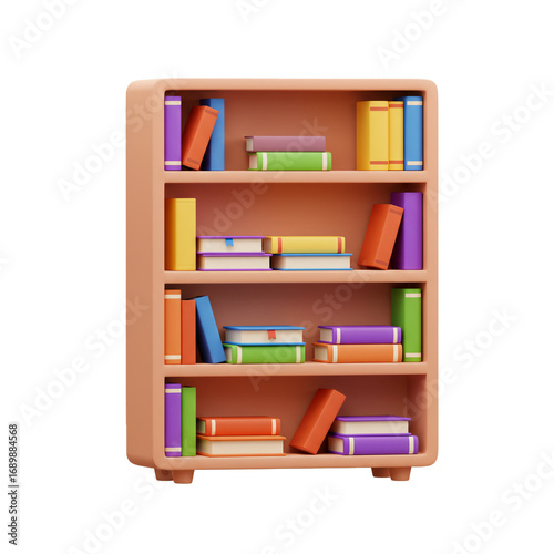 A colorful rendered wooden bookshelf with four shelves, neatly arranged with a variety of books, isolated on a transparent background for educational concepts.