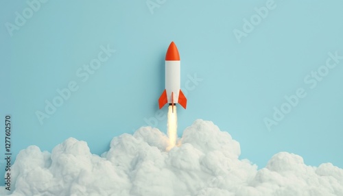 A colorful rocket ascends through fluffy clouds against a blue background, symbolizing innovation and exploration.