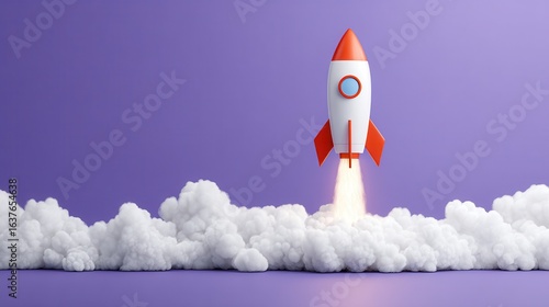 A colorful rocket launches into the sky, leaving a trail of smoke, set against a purple background, symbolizing adventure and exploration.