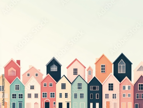 A colorful row of whimsical houses against a soft backdrop, showcasing charming architecture and vibrant hues.