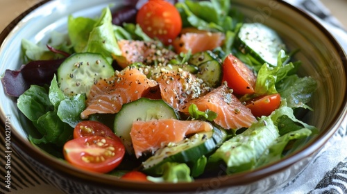 A colorful salad bowl filled with mixed greens, cherry tomatoes, cucumber slices, and chunks of smoked salmon, drizzled with tangy vinaigrette.