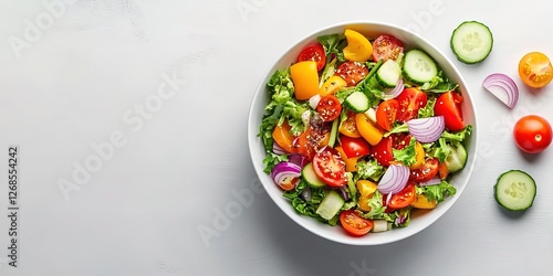 A colorful salad with vegetables in a white bowl on a grey background, in a flat lay style.