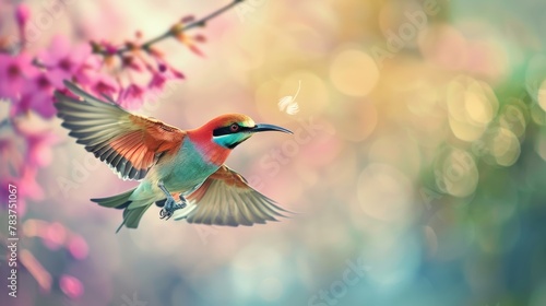 A colorful song bird flying over a tree with pink flowers