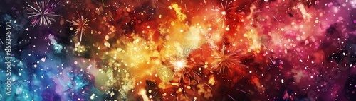 A colorful space background with fireworks in the foreground. The fireworks are in different colors and sizes, creating a sense of excitement and wonder. Scene is one of celebration and joy