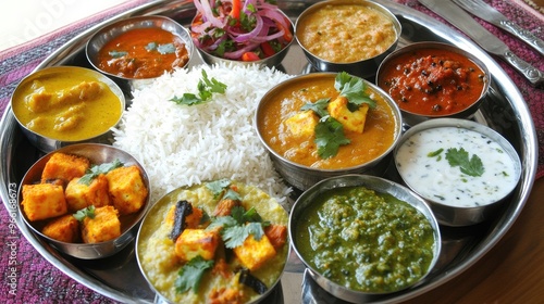 A colorful thali platter featuring a variety of Indian dishes including dal, paneer curry, vegetable sabzi, and rice, arranged on a traditional metal plate with vibrant colors.