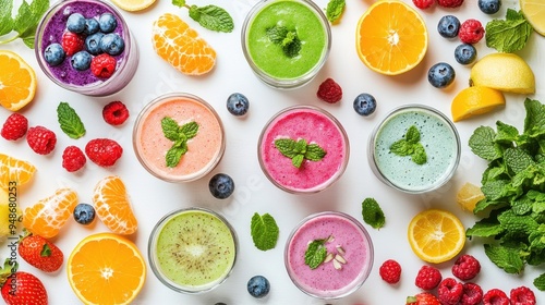 A colorful variety of smoothies is artistically displayed alongside fresh fruits and mint, highlighting healthy ingredients and appealing colors