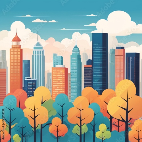 A colorful vector illustration of a cityscape with high-rise buildings, trees, and clouds in a modern, minimalist style