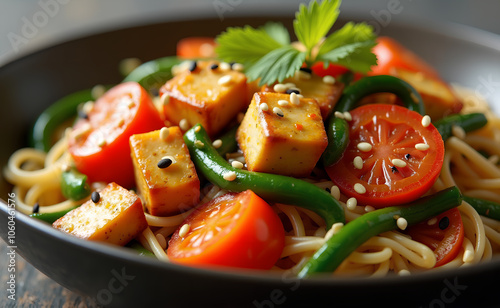 A colorful vegetable stir-fry with tofu and sesame seeds.