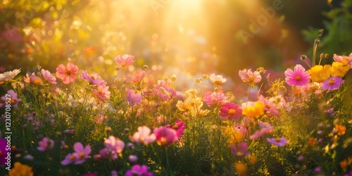 A colorful wildflower meadow illuminated by warm, golden sunlight, showcasing the beauty and tranquility of nature.
