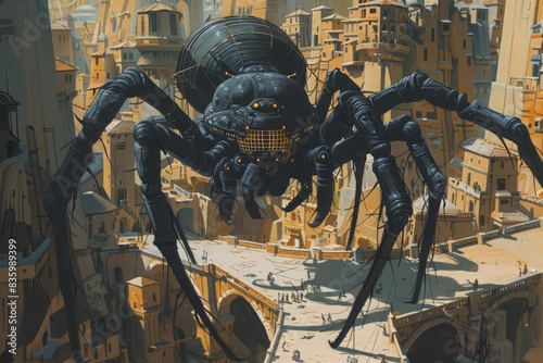 A colossal spider looms over a bustling city, its eight legs casting long shadows on the cobblestone streets below.