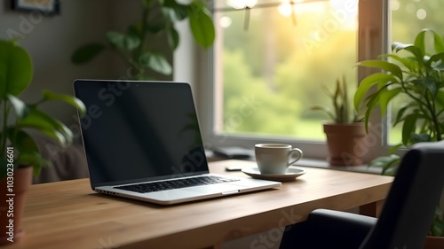 A comfortable home office setting with modern gadgets, a cup of coffee, a laptop, and a window view of nature, representing a peaceful and productive remote work lifestyle