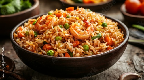 A comforting image of fried rice served in a traditional bowl, with crispy shrimp and vegetables mixed in, evoking a sense of home-cooked goodness.