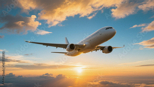 A commercial jetliner casts a silhouette against the vibrant sunset sky during its flight, embodying the essence of air travel
