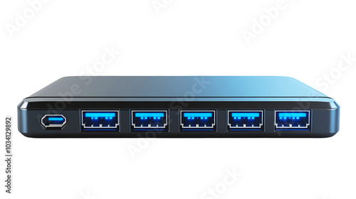 A compact USB hub with multiple ports isolated on a transparent background, PNG