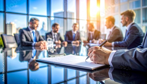 a company secretary is summarizing the results of the meeting, hand holding a pen and writing the minutes in a meeting agenda notebook, the atmosphere of the meeting is being conducted in a room
