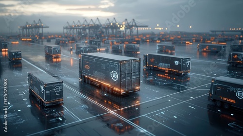 A complex and interconnected container terminal operating at a major port during the evening hours as cargo ships cranes and storage facilities are illuminated in the twilight