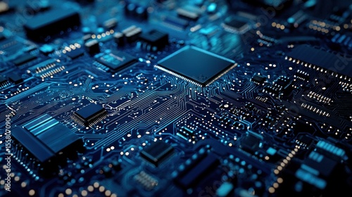 A complex electronic circuit board with blue and black components and intricate wiring.